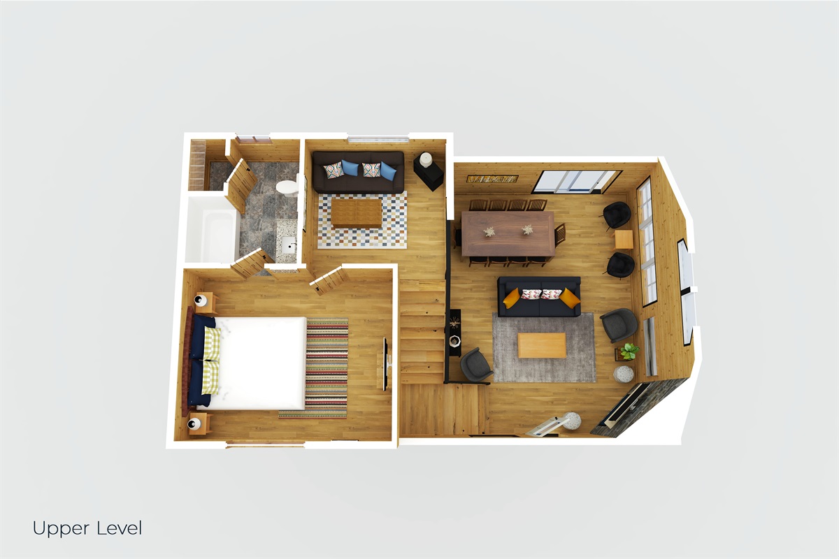* Upper-level master: King bed, full en-suite bath, Smart TV